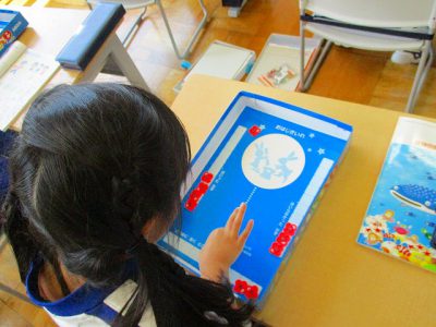 今日は「10の合成・分解」の習得を目指して、算数セットに入っている「おはじき」や「カード」を使いました。