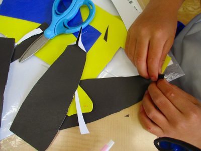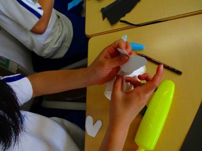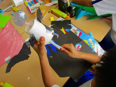 上下に動く仕組みから、どんな生き物にしようかなとアイディアをふくらます2年キッズ。