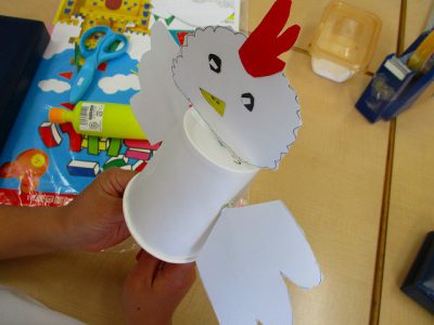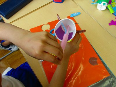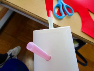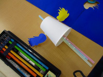 今日は先週からの続きで、紙コップとストローを使った紙工作の仕上げに取り組みました。
