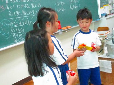 バースデー係さんがお祝いのひとときを呼びかけて、牛乳の乾杯とプレゼントを渡してくれました。