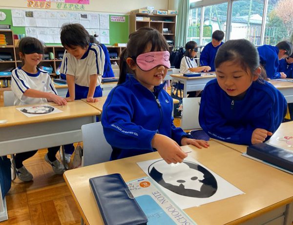 今日の主な英語学習は、ペアで福笑いです。