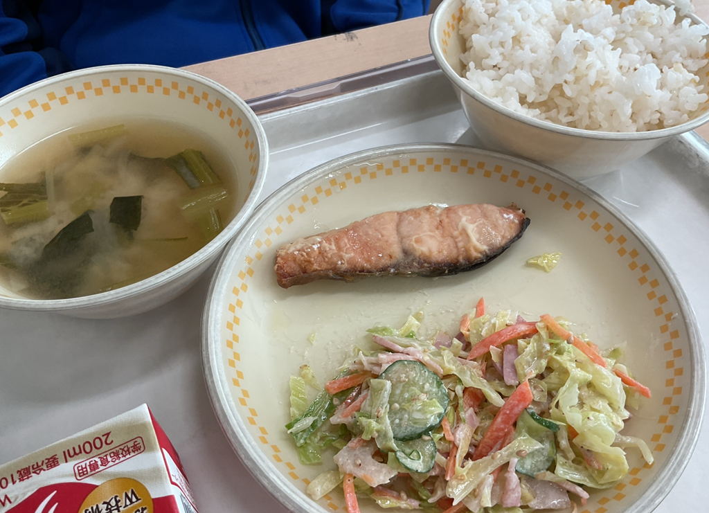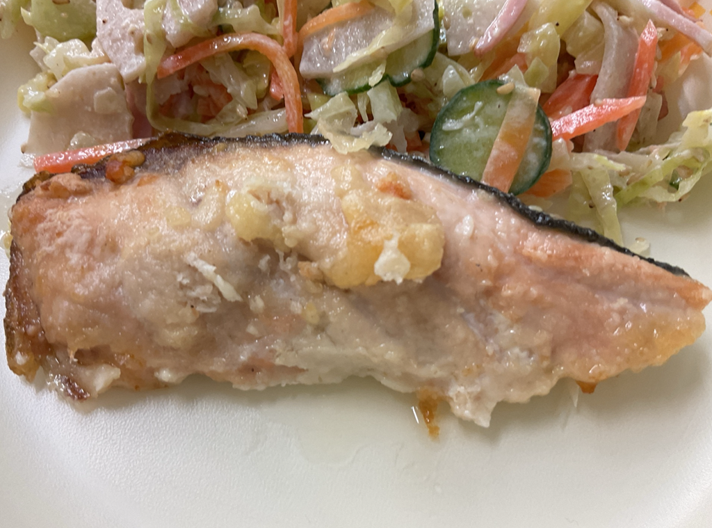 ☆ 「鮭のムニエル」は、溶かしたバーターを鮭にかけて焼きました。小麦粉をはたいてから焼いた鮭は焼き上がりがカリッと仕上がりました。