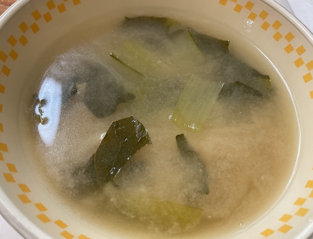 ☆ 「油揚げのみそ汁」は、小松菜と玉ねぎのみそ汁に油揚げを合わせました。