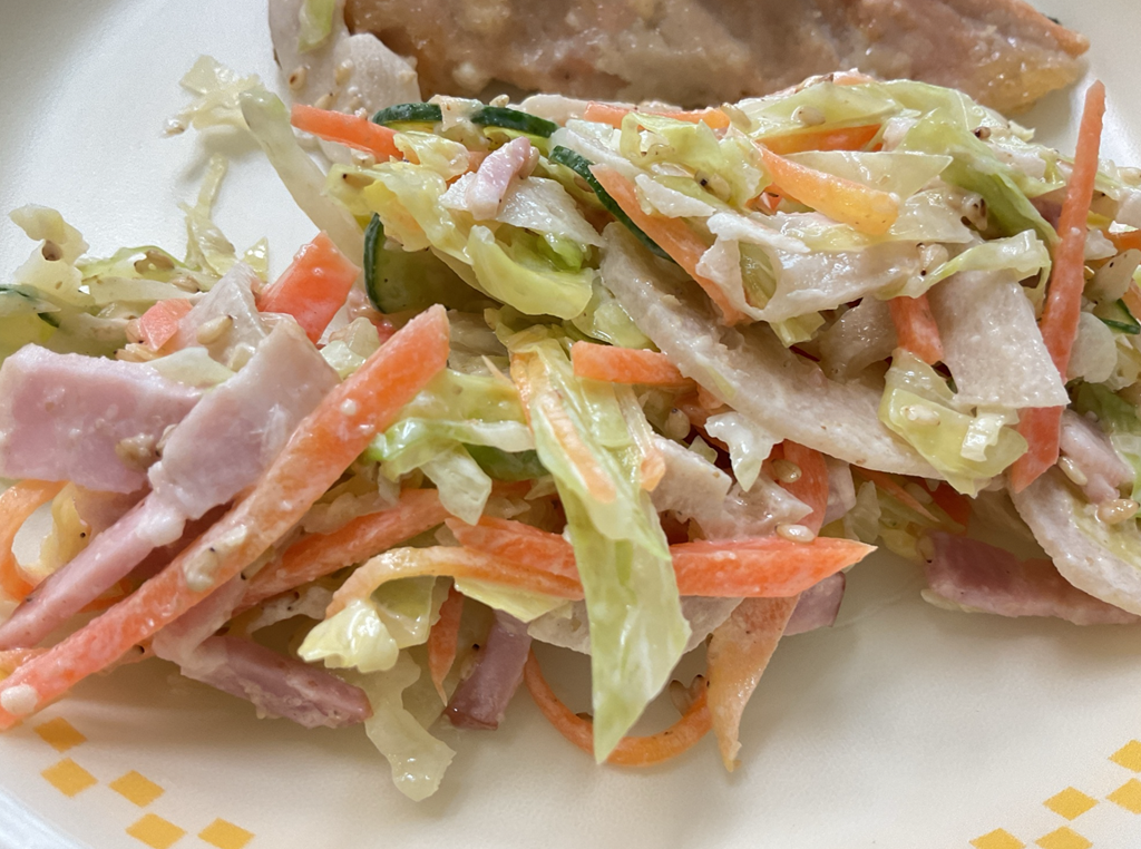 ☆ 「れんこんのゴママヨサラダ」は、れんこんのサクサクとした食感が歯ごたえ良く、サラダがおいしくなりました。れんこんには少し下味を付けて煮てあります。