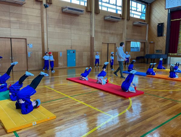 We warmed up with freestyle jump ropes before repeating the stretching exercises from last week – the children had remembered the English sentences very well.