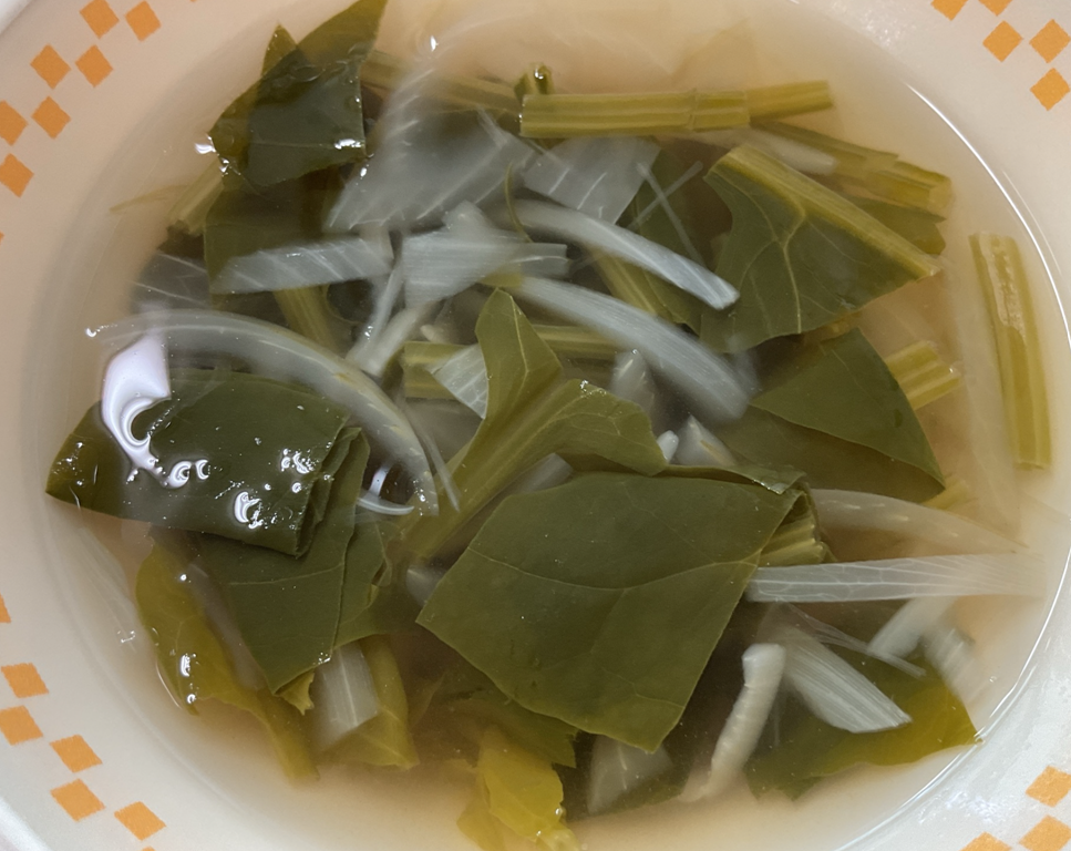 ☆ 「すまし汁」は、緑色が鮮やかなほうれん草を使いました。玉ねぎからは甘みが出て、すまし汁の出汁がさらにおいしくなりました。
