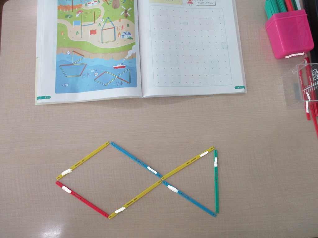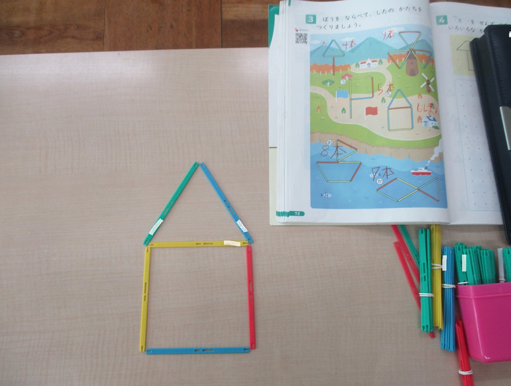 教科書を見ながら何本でできるか考えた後、棒を動かしています。