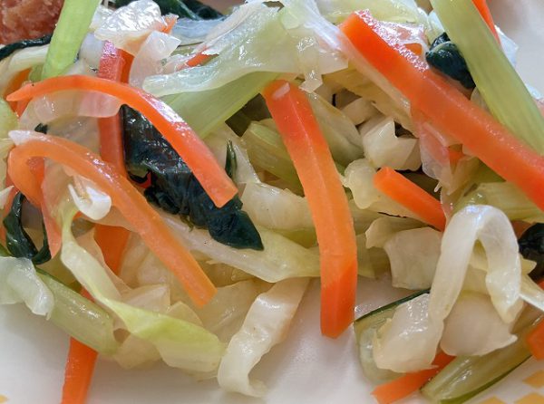 ☆ 「キャベツのカレー和え」は、カレー風味のドレッシングが野菜によく合います。キャベツと小松菜、人参を合わせました。