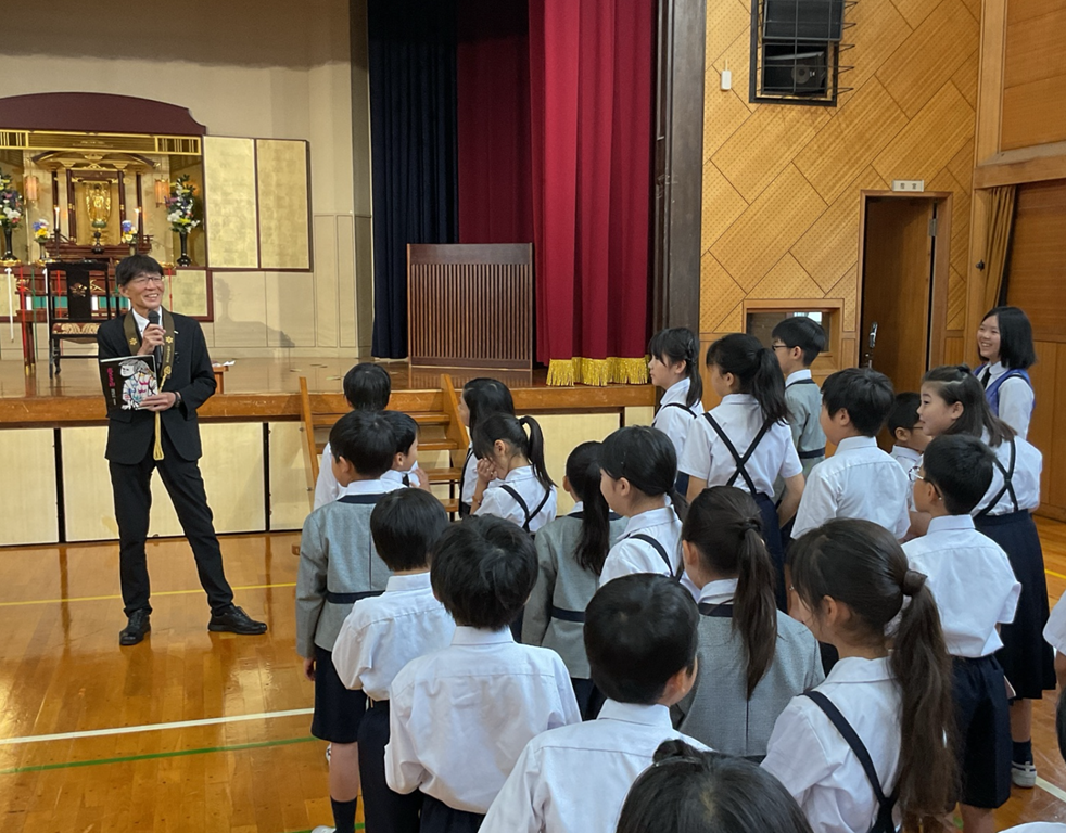 次に、全校遠足に向けたお話です。「花さき山」の本の紹介と「利他の心」を結びつけたお話から、遠足を楽しむために守るべきことを学びました。