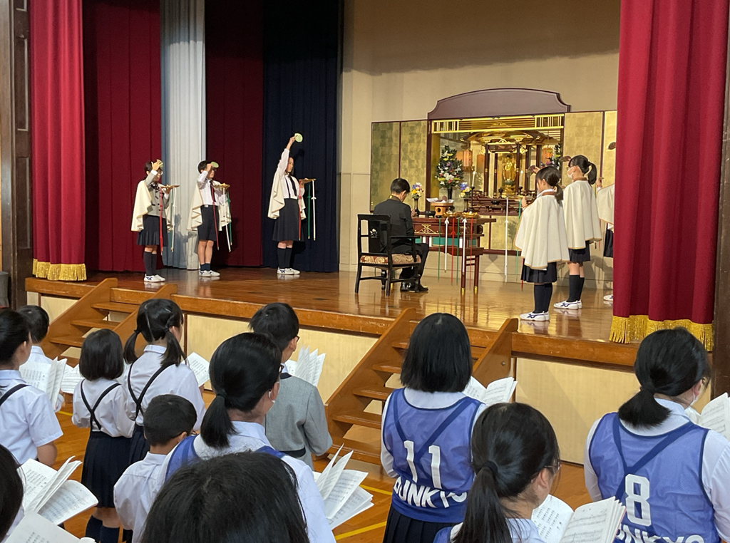 礼拝の朝です。阿弥陀さまの御前には、2年生が収穫したさつまいもがお供えされていました。