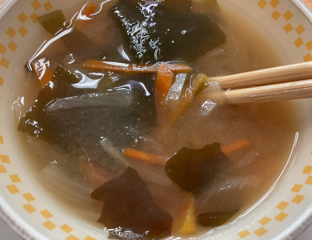☆ 「玉ねぎの味噌汁」は、たっぷりの玉ねぎと人参、わかめを合わせました。野菜の甘味とうま味を感じられるお味噌汁に仕上がりました。