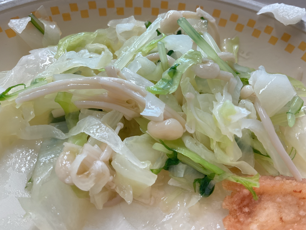 ☆ 「キャベツのおひたし」は、えのきの食感がおいしいおひたしに仕上がりました。たっぷりの出汁にひたして、味が染み込むように工夫しました。