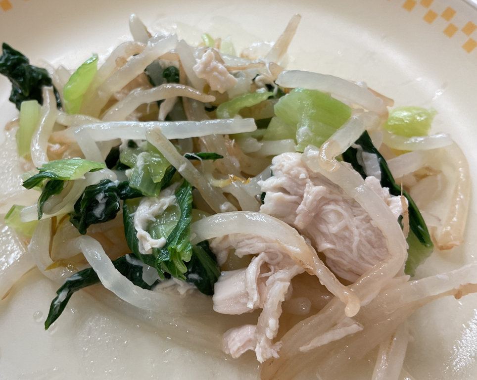 ☆ 「チンゲン菜の和え物」は、もやしとチンゲン菜、鶏のささみ肉を合わせた和え物です。酢とごま油を合わせたドレッシングは酸味が効いていて、野菜によく合いました。