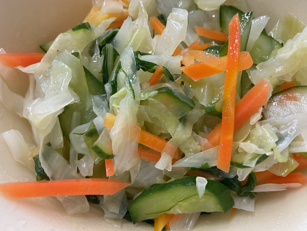 ☆ 「フレンチサラダ」は、キャベツ、人参、きゅうり、水菜を合わせたサラダです。ドレッシングで使ったお酢の酸味がさわやかで、シャキシャキ食感がおいしいサラダになりました。