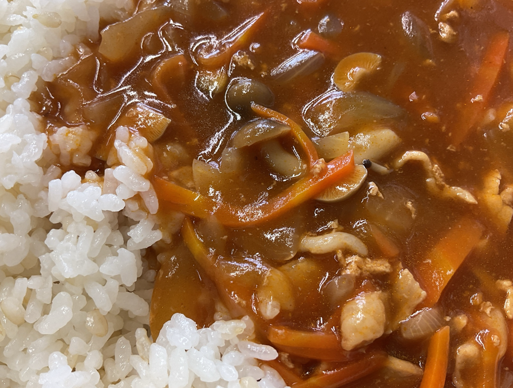 ☆ 「ハヤシライス」は、トマトピューレやケチャップの酸味が効いています。やわらかく煮込んだ、たっぷりの玉ねぎと食感の良いしめじがおいしいハヤシライスになりました。