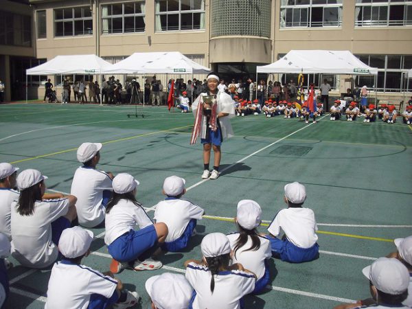 5,6年生が出場する時は、4年生の即席応援団が出来上がります! 見よう見まねで覚えた拍子で、熱のこもったエールを送りました!