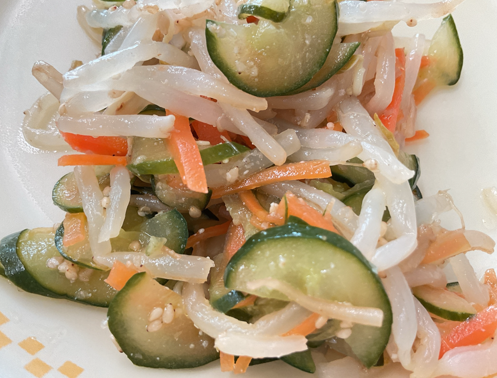 ☆ 「きゅうりのサラダ」は、きゅうりや人参、もやしにすったゴマと甘酸っぱいドレッシングをかけてあえました。ごま油の香ばしさもするドレッシングでした。