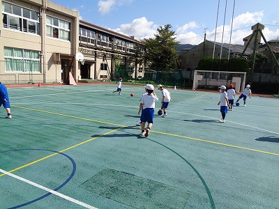 学習の前半は、ボールを蹴る練習を行いました。まずは、グラウンドを広く使ってフリーランパスです。