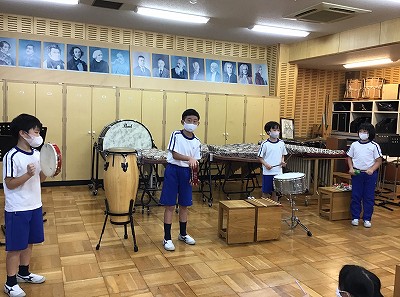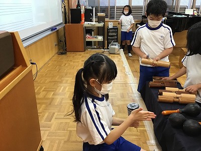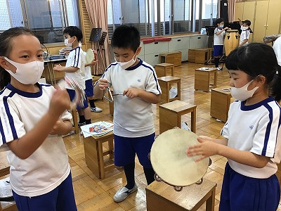 「♪森のたんけんたい」のメロディに合わせて、リズム楽器の演奏を加える学習の仕上げ時間です。