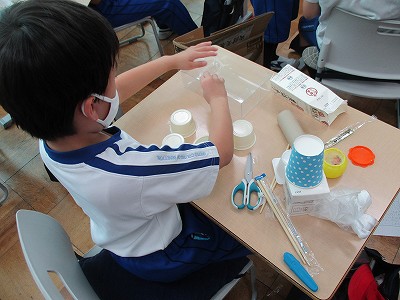 各自が用意した材料と、学校で準備した材料を使って、楽しいおもちゃ作りです。