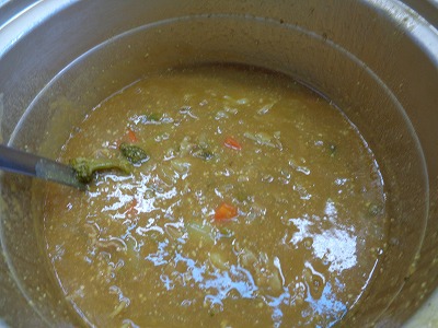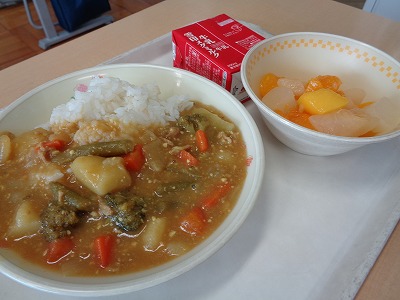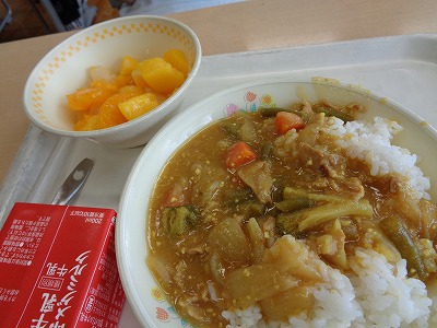 体をつくる食べ物は、豚肉のほかにも細かく砕いた大豆を混ぜています。ブロッコリーや三度豆など緑色のきれいな野菜や、人参、じゃがいもなどたくさんの野菜を使って作ります。様々な食べ物が入ったカレーでおいしく仕上がりました。