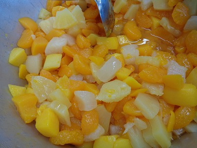 フルーツカクテルは、みかん、黄桃、パイナップル、なしのシロップ漬けを合わせています。