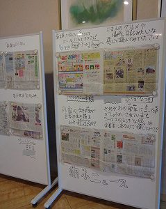 職員室前や2階廊下に、小学生新聞掲示をしたホワイトボードがいくつかあります。