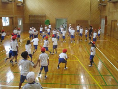 今日は「英語ドッジ・ソフトフリスビー」をしました。