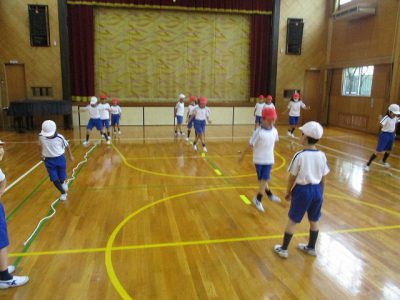 体を動かしながら音読練習。 高く大きな声でスラスラと発声できていました。