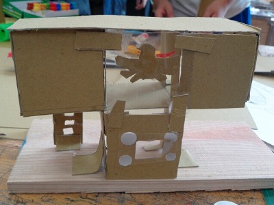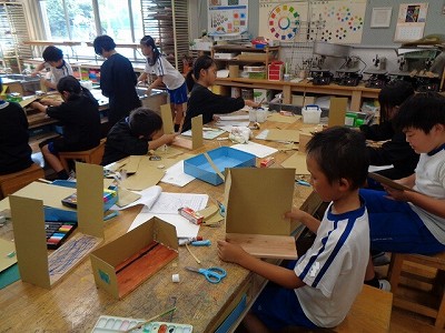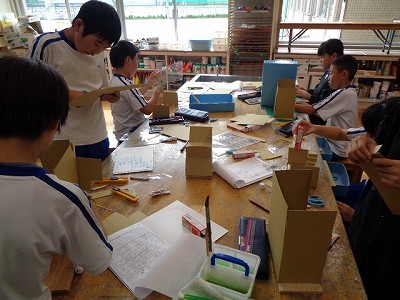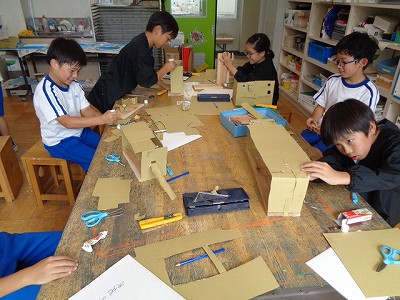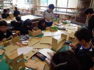 図工授業では、先週から本格的に「ビーンズハウス」作りに取り組んでいます。のこぎりで切った土台の板に、段ボールを切り取って組み立てて行きます。大きさも、形も、色づけするもしないも、本人次第。楽しめるかどうかも、本人次第のところもあります。