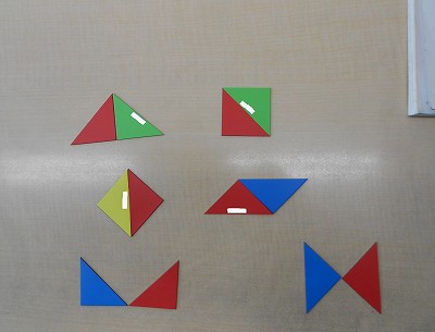 今日は色板を並べて、色々な形を作りました。まず、色板を2枚だけ使って、どんな形ができるか、机の上に並べてみました。