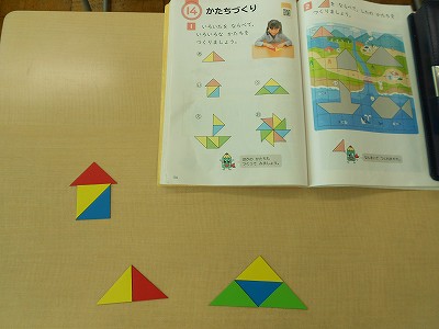 並べる前に、色板を何枚使うかをみんなで確かめてから、形作りに取り組みました。直角をどの向きに置いて並べるかをポイントにして並べています。