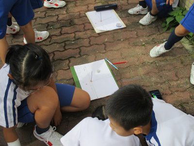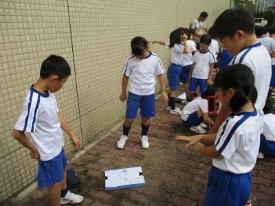 実験道具の確認後、外に出て、時間毎に「かげの位置」を記録しました。