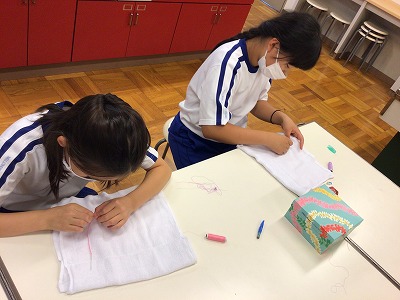 雑巾づくりはミシンを使って行いますが、その前に好きな色の糸を選んで、刺繍をしてみました。
