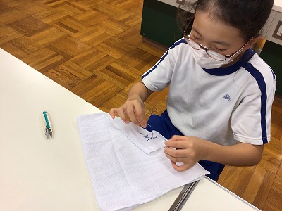今日のECO生活クラブは、前回の続きと「雑巾づくり」にチャレンジしました。針さしの残りの作業は、キャップのまわりにリボンをまいて完成です!かわいらしい針さしが作れました。