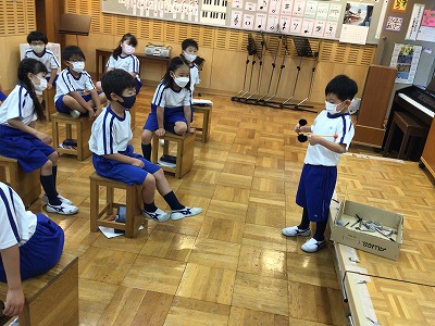 今日も、音楽室の打楽器紹介を行い、打ち方や打つ場所によって、音色が違うことを感じる学習に取り組みました。