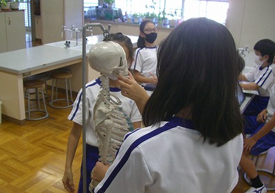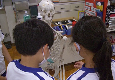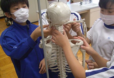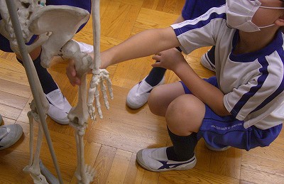 まずは、体にある関節探しです。自分をさわったり、模型を触って調べました。
