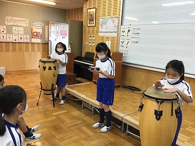 1学期の学習で少しふれていた曲です。“コンガ”の低音リズムに、「カシャカシャ系」の“カバサ”や“シェーカー”を選んでいる友達がいました。