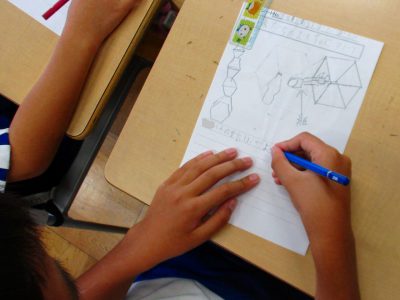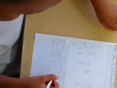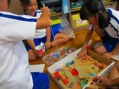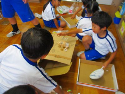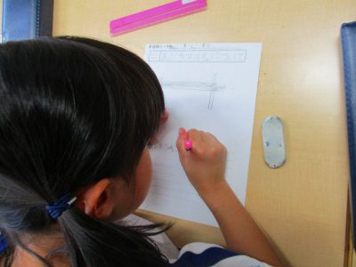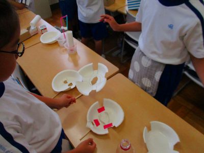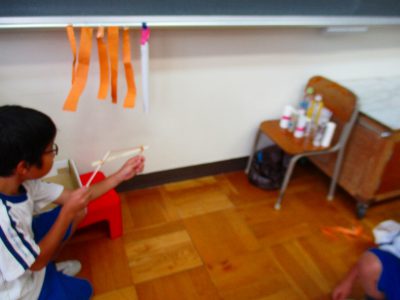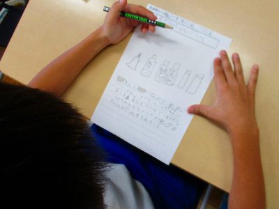 空気砲の的の置き方や、飛ばし方、わりばしでっぽうの仕組みなど、気になった点をプリントに書くまとめをしました。