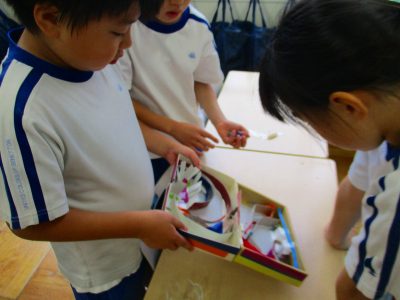 「ぼくなら、ここに切り込みを入れるなぁ」と、アドバイスのような気づきを求めて、友達が作ったおもちゃで遊ぶ時間です。