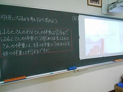 その後、昨日に引き続き「2倍の3倍は何倍になるのか」を考える割合の問題を解いていきます。すっかり書き慣れてきた「図」を使って、どんな風に考えればよいかを説明していきました。「もとになる数」はどれなのかを考えるところがポイントです。