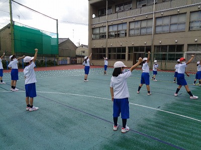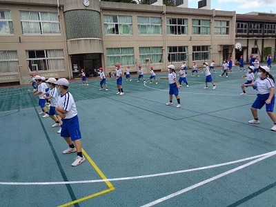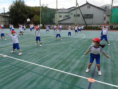 4年生との合同体育では「ソーラン節」の演舞練習です。