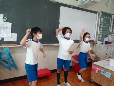 日直さんが考えた「今日のみんなのめあて」は、"Do my (your) best!" "Practice, practice, practice!"です。いつもの「英語で伝える」から「英語を使って、体の動きも入れて伝える」に飛躍した すばらしい司会ぶり! 3人の身振り手振りもそろっていました。Great job, Nicchoku-san.