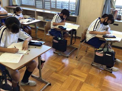 毎朝一番の「漢字ドリル聞き取りテスト」に加え、今朝は「10分間スピードチェック」という書写教材『うつしまる』に取り組むことから、始まりました。