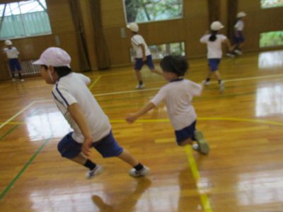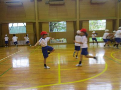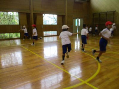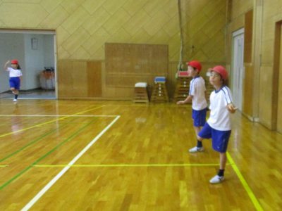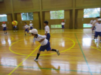 後半は、ドッジボール。先生から、いつもと少し違うルールの説明に、集中するみんな。