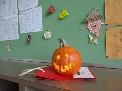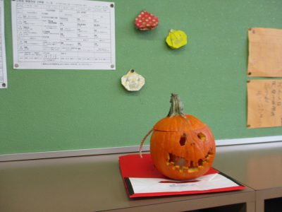 友達が届けてくれた“カボチャのランプ”の後ろに、ハロウィン仕様の飾りが並びます!