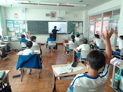 机→黒板→プールの面積がどれほどで、縦・横、どんな数のかけ算で答えが導けるのかを考えたりもしました。