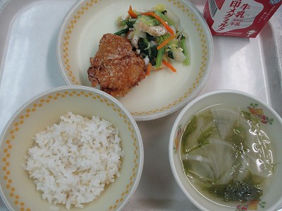 信田というのは、「油揚げ」を使った和え物や煮物の名前に使われます。油揚げは別に味をつけるため、少し煮込んであります。小松菜や白菜は食べやすいように、切り方やゆで加減に注意しています。葉物の野菜は少し食べづらさがありますが、ビタミンA・ビタミンCをたっぷり含んでいるので、積極的に食べて体を元気にしましょう!