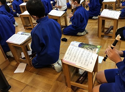 その少しさみしげな曲の雰囲気を感じ、歌唱しました。リコーダー奏を計画しているので、音楽室での“エア”練習を行いました。