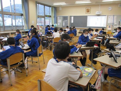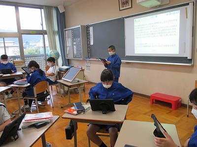 国語の時間は「よりよい学校生活のために」の第三時間目の話し合いです。今日は、ロイロノートを使ってまとめた、各チームの話し合いの成果を発表しました。